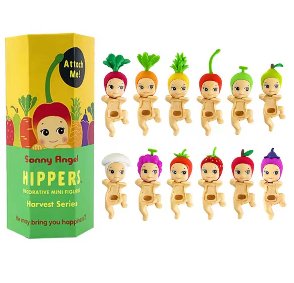 Sonny Angel, które można przyczepić do niemal wszystkiego wokół siebie. Tematem drugiej serii Hippers jest „Harvest”, przywołujący na myśl sezonową obfitość owoców i warzyw.